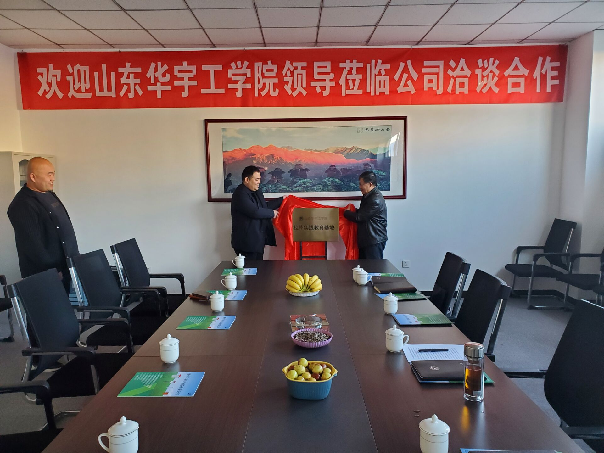 11月12日下午,beat365在线体育官网登录入口与德州仁铭电气设备有限公司联合共建校外实践教育基地揭牌仪式在德州科海创业园举行。副校长王春光与仁铭公司负责人曹延明共同为基地揭牌。