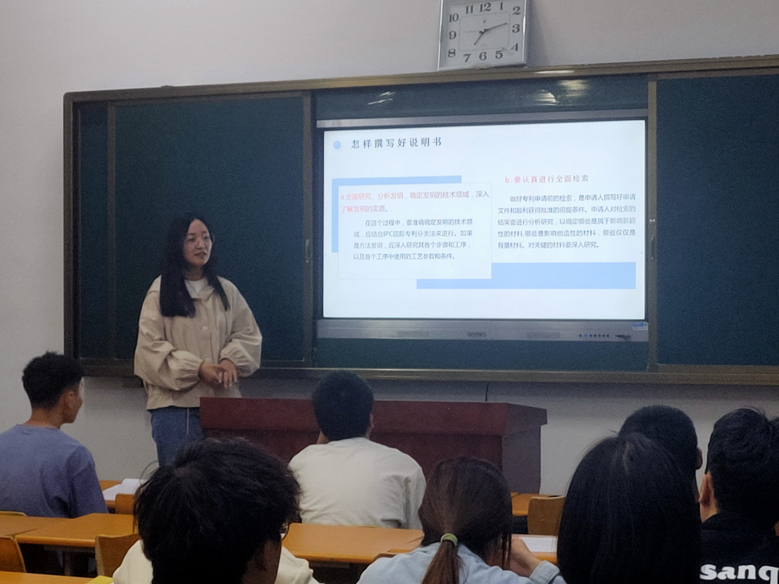 为进一步推动科技创新,促进知识产权保护,beat365在线体育官网登录入口学生会副主席孙瑞环在4月29日晚自习于22教学楼507教室为20级软件技术的各位同学进行专利说明撰写讲解活动。