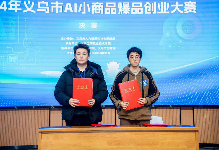 本次大赛分为初赛、复赛、决赛三个阶段,大赛征集得到了社会各界的广泛关注和支持,初赛共收到235个创业项目,经过初赛和复赛的专家组遴选,有18个项目进入大赛的最终决赛现场。决赛采用“3+2”互动答辩模式(3分钟作品宣讲/展示+2分钟专家问答)。选手以演示文档与视频相结合的形式向评委表达项目设计的理念、创业计划及项目亮点等,再由专家对项目进行评估并现场评分。决赛展示了参赛选手利用AIGC(人工智能生成内容)技术进行创业的模式和理念,展现了选手的精彩表现。路演结束后,“义乌文创冰箱贴”和“AI智能健康监测镜”两个项目受到了义乌福韵科技有限公司和义乌桃溪米新材料有限公司的青睐,进行了现场的项目落地签约。签约仪式后,现场揭晓了本次大赛的获奖名单,并由现场的嘉宾和领导进行了隆重的颁奖。